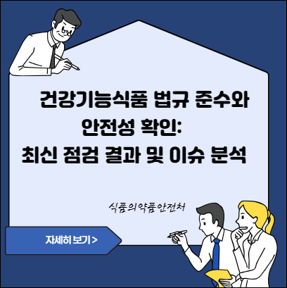 건강기능식품은 소비자들에게 신체적인 이점을 제공하는 것으로 인기가 높지만, 부적절한 광고나 기능성분의 부족으로 인해 안전성 문제가 발생할 수 있다. 이에 건강기능식품 시장을 안전하게 유지하기 위해 식약처는 법규 준수를 강조하고 허위·과대광고 등의 불법 행위를 단속하고 있다. 또한, 건강기능식품의 올바른 섭취와 이에 따른 안전성 유지를 위해 수입 제품의 정밀검사도 실시하고 있다.