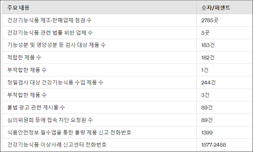 식약처가 5월에 건강기능식품 업체를 집중 점검하여 건강기능식품에 관한 법률을 위반한 5곳을 적발하였으며, 이에 대한 행정처분을 요청했다. 또한, 건강기능식품 제조·판매업체 2785곳을 대상으로 시장에서 많이 판매되는 제품들에 대한 기능성분 및 영양성분 함량, 규격 적합 여부를 확인하는 수거 및 검사를 실시하였다.