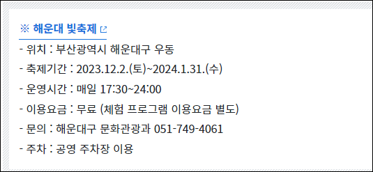 3. 부산 해운대 빛축제: 12월 2일부터 해운대 해수욕장과 주변에서 '희망, 빛으로 다시 한번'을 주제로 빛 조형물과 다양한 프로그램을 즐길 수 있는 축제입니다.