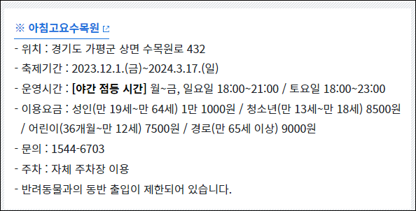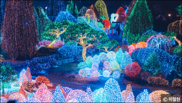 2. 가평 아침고요수목원 오색별빛정원전: 10만 평 규모의 정원에서 사랑, 동물, 식물 등 다양한 테마의 빛 조형물로 꾸며진 축제입니다.