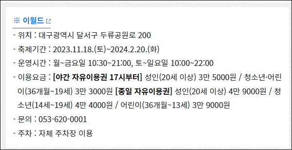 - 대구 이월드: 겨울이면 일찍 지는 해를 대신해 화려한 불빛으로 밤을 밝히며, 다양한 포토존과 테마존에서 특별한 추억을 만들 수 있습니다.