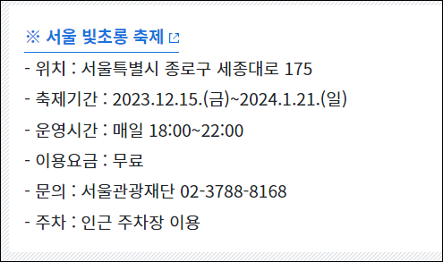 - 서울 빛초롱축제: 서울의 밤을 빛으로 채우며, 광화문광장 마켓과 동시에 진행되어 볼거리, 즐길거리, 먹거리를 제공합니다.