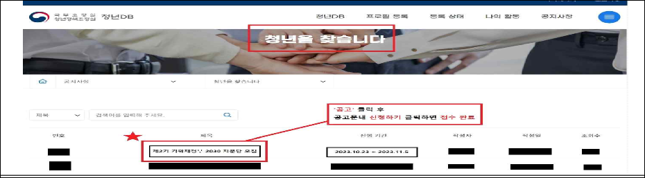 3. 지원방법 | □ 접수기간: ’23. 10. 23일(월) ~ 11.5일(일) 24:00까지(2주간) □ 접수방법: 청년DB(www.2030db.go.kr) 통해 온라인 접수 ㅇ 회원가입 및 지원신청 방법은 ‘붙임’ 필독 |