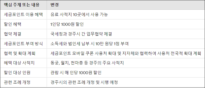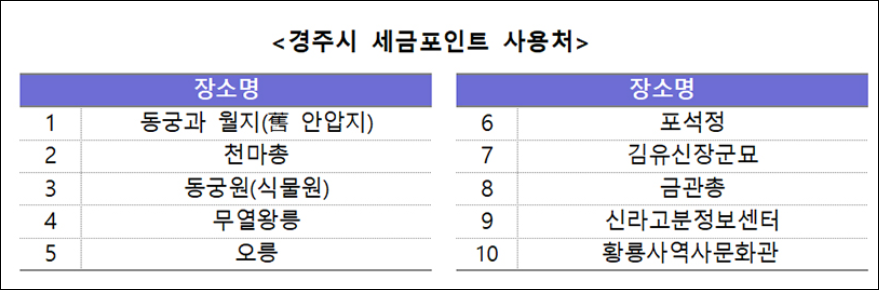 국세청과 경주시가 업무협약을 체결하여, 세금포인트를 통해 경주의 사적지 관람에 할인 혜택을 제공하는 새로운 제도가 도입되었다. 이를 통해 개인과 기업이 세금을 성실하게 납부한 경우 세금포인트를 획득하고, 이를 이용하여 경주의 유료 사적지 10곳에서 관람할 때 1인당 1000원의 할인을 받을 수 있다.