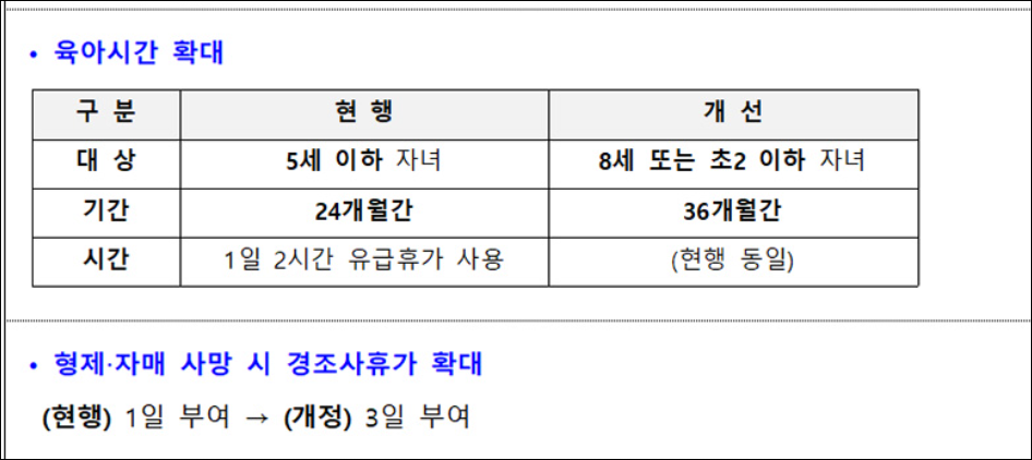 - 육아시간 및 휴가제도가 대대적으로 개선됩니다.