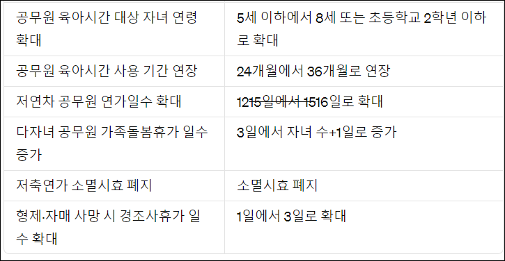 - 육아시간 및 휴가제도의 확대는 공무원의 업무효율성 향상과 업무 집중을 돕기 위함입니다.