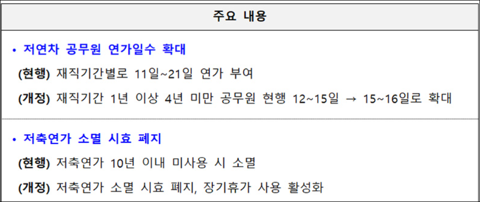 2. 저연차 연가 확대: - 재직 기간이 1년 이상 4년 미만인 저연차 공무원의 연가일수가 최대 3일 늘어납니다.