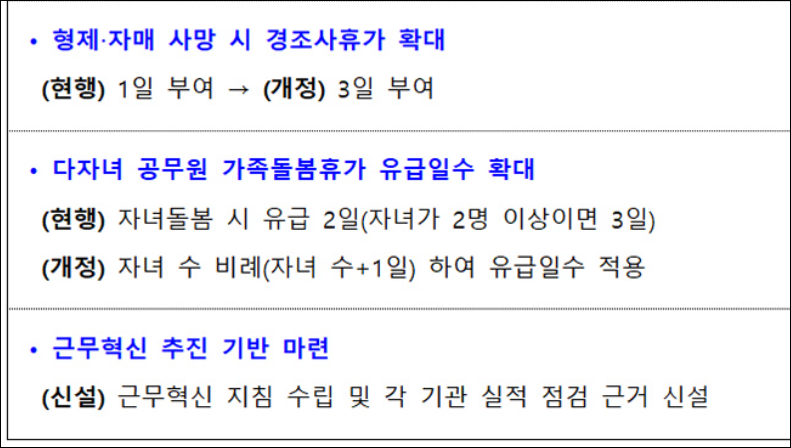 4. 기타 개선사항: - 저축연가 소멸시효 폐지 및 경조사휴가 확대 등의 제도적 개선이 이루어집니다.