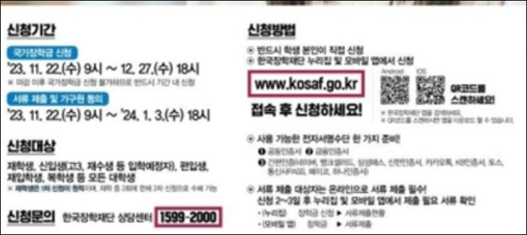본 내용은 2024학년도 국가장학금 1차 신청에 대한 안내입니다. 국가장학금은 학자금 지원 8구간 이하인 대학생 중 성적 기준을 충족한 학생에게 국가 차원에서 지원하는 소득연계형 장학금입니다. 대학생들의 등록금 부담을 완화하는 목적을 가지고 있습니다. 이번 2024학년도 국가장학금 1차 신청일은 11월 24일 오전 9시부터 12월 27일 오후 6시까지입니다.