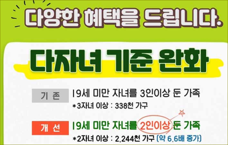 정책 변경으로 2자녀 가구가 국립자연휴양림을 이용할 경우, 다자녀 가구 혜택을 적용받기 위해서는 산림휴양 통합플랫폼 '숲나들e'를 통해 예약하고 혜택을 신청해야 한다. 주중 기준으로 객실 '숲속의 집' 4인실을 예약할 경우, 기존 이용요금 4만 5000원에서 3만 1500원으로, 주말과 성수기에는 8만 2000원에서 7만 3800원으로 할인된다.