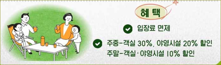 | - 주중 이용 시: 객실 '숲속의 집' 4인실 기준, 4만 5000원에서 30% 할인된 3만 1500원. - 주말 및 성수기 이용 시: 동일 객실 기준, 8만 2000원에서 10% 할인된 7만 3800원. - 야영시설 주중 이용 시: 기존 요금에서 20% 할인. - 야영시설 주말 이용 시: 기존 요금에서 10% 할인. |