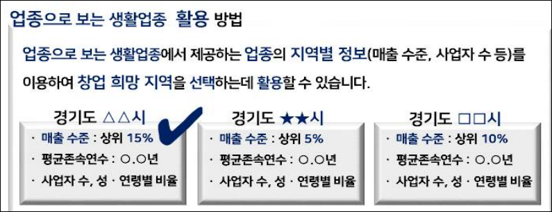 A. 업종으로 보는 생활업종에서 호프주점·연 매출 2억 원 입력 결과 경기도 △△시가 매출 수준과 사업자 수 등을 고려할 때 가장 적합한 지역으로 확인되는 등 창업 결정에 유용하게 활용할 수 있습니다