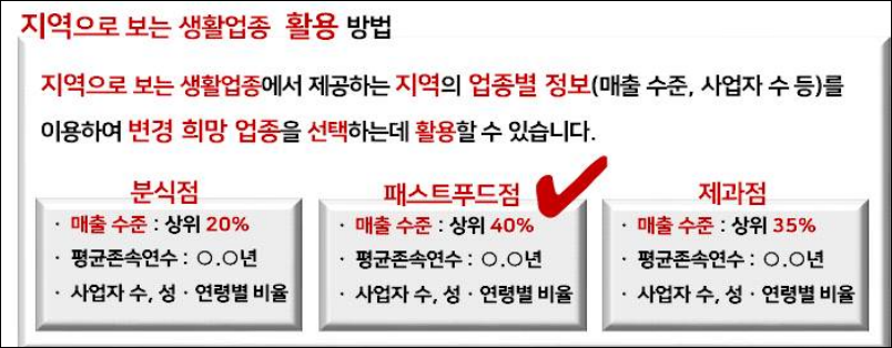 A. 지역으로 보는 생활업종에서 서울특별시 △△구·연매출 3억 원 입력 결과 패스트푸드점이 매출 수준과 사업자 수 등을 고려할 때 가장 적합한 업종으로 확인되는 등 업종 변경 결정에 유용하게 활용할 수 있습니다.