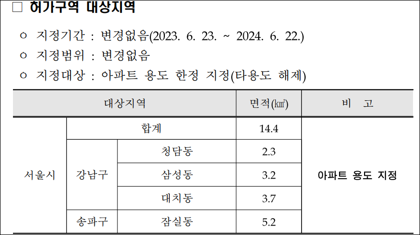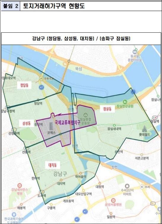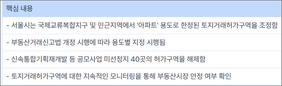서울시는 부동산거래신고법의 개정 시행을 토대로 국제교류복합지구 및 인근지역(송파구, 강남구)의 일부 지역에서 '아파트' 용도에 한정된 토지거래허가구역을 조정하였습니다. 이를 통해 토지의 용도별 지정이 시행되었습니다. 또한, 신속통합기획 재개발 등의 공모사업에 미선정된 40곳(면적 2.13㎢)의 토지거래허가구역을 해제하였으며, 향후 부동산시장의 안정 여부 등을 모니터링하여 토지거래허가구역에 대한 지속적인 관리를 진행할 예정입니다.