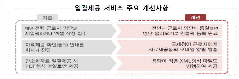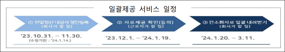 - 국세청은 근로자들의 연말정산을 간편하게 처리하기 위해 "간소화자료 일괄제공 서비스"를 제공합니다. - 근로자들은 회사가 국세청에 근로자 명단을 등록하면 신청이 완료됩니다. 신청은 11월 30일까지 가능하며, 수정이 필요한 경우에는 1월 14일까지 가능합니다. - 이 서비스를 통해 근로자들은 홈택스에 접속하거나 세무서를 방문할 필요 없이 손쉽게 자료를 확인할 수 있으며, 회사는 자료 제출에 소요되는 시간과 노력을 줄일 수 있습니다.