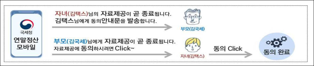 - 올해 성인이 된 자녀가 있는 경우, 부모에게 자료제공 종료 안내 및 자녀에게 동의 안내문이 발송됩니다. - 자녀는 모바일을 통해 간단한 동의 절차를 완료할 수 있으며, 이를 통해 제때 연말정산 소득공제 혜택을 받을 수 있습니다. - 모바일에서의 안내 및 동의 절차를 통해 부모와 자녀는 간편하게 자료 제공을 완료할 수 있습니다.