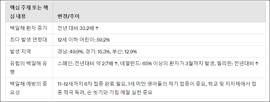 이런 상황이 발생한 이유는 전 세계적으로 아동과 청소년을 중심으로 백일해가 유행하고 있기 때문입니다. 특히 유럽을 비롯한 여러 국가에서 백일해 발병이 급증하고 있으며, 전파력이 강한 이 감염병은 접종되지 않은 아이들뿐만 아니라 주변 친구와 가족에게도 전파될 수 있어 상당한 우려가 있습니다. 이에 따라 예방접종이 중요하며, 적절한 예방수칙과 주의가 필요합니다.