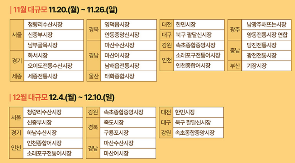 최초 53개 시장에서 진행할 계획이었으나 지자체의 건의를 수용해 추가 수요조사를 실시하고, 최종적으로 90개 시장을 선정해 행사를 확대한다. 행사 규모는 시장 여건에 따라 31곳은 상시 개최, 24곳은 소규모 특별전, 35곳은 대규모 특별전으로 진행된다. 소비자들은 해당 시장에서 국산 수산물을 구매한 뒤 행사 부스에서 구매 금액이 2만 5000원 이상 5만 원 미만이면 1만 원, 5만 원 이상이면 2만 원 상당의 온누리상품권을 환급받을 수 있다.