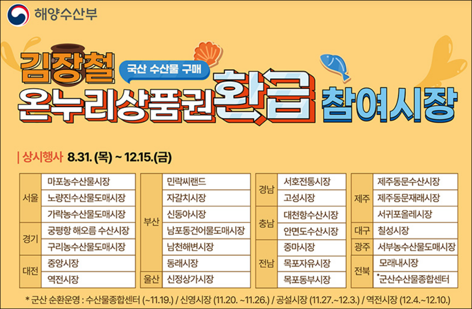 해양수산부는 20일부터 연말까지 김장철을 맞아 대한민국 수산대전-온누리상품권 환급행사를 확대 개최한다고 밝혔다. 온누리상품권 환급행사는 시장에서 구매한 국산 수산물 금액의 최대 40%