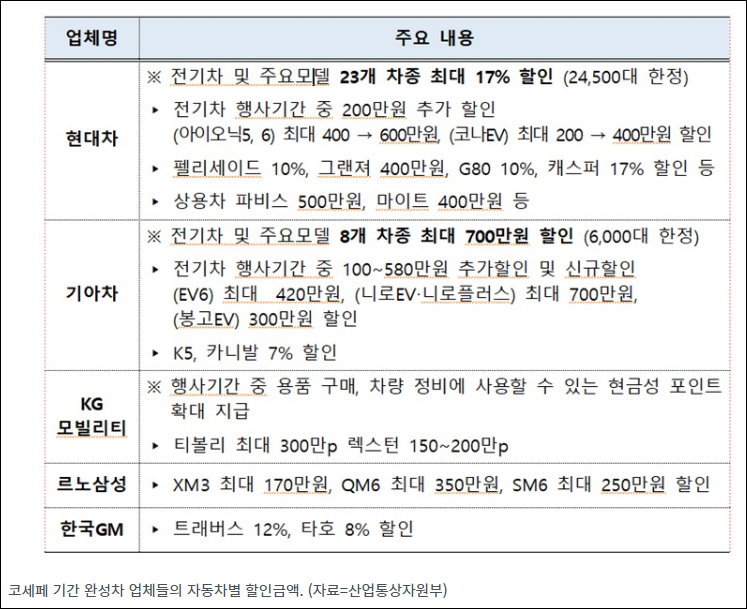 [코세페 기간의 자동차 구매 꿀팁] 현대차와 기아차 등 코세페에 참여한 국산차 업체들은 서로 경쟁적으로 할인 혜택을 제공하고 있습니다. 현대차는 전기차를 비롯한 주요 모델 23개 차종을 할인하며, 기아차는 전기차 및 주요 모델 8개 차종을 저렴한 가격에 판매합니다. 특히 현대차의 '캐스퍼'는 최대 17%의 할인율을 제공하므로, 이 기간에 구매하면 큰 이익을 볼 수 있습니다.