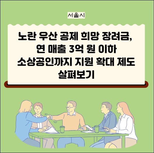 노란우산공제노란 우산공제 희망장려금은 신규 가입 소상공인에게 1년간 월 납입금 중 2만 원씩 총 24만 원이 지급되는 지원이다. 이 지원 대상이 연매출 2억 원에서 3억 원 이하의 소상공인까지 확대되었다. 이러한 지원은 소상공인의 생활 안정을 도와주는 노란 우산공제 가입을 촉진하는 목적을 가지고 있다. 서울시의 지원 덕분에 서울지역 소상공인 노란 우산공제 가입률은 2023년 말에는 38.3%(585,471명)까지 늘어났다.