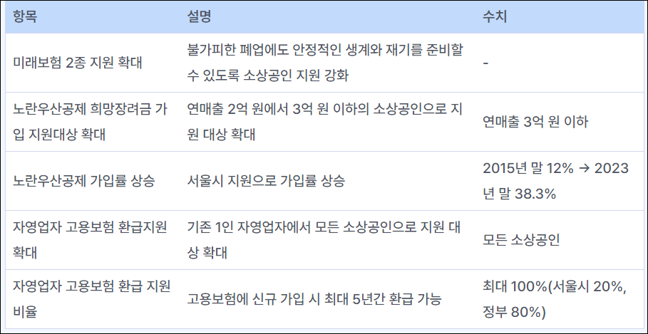 서울시는 매출 감소나 건강 문제 등으로 폐업 위기에 처한 소상공인을 위해 '미래보험 2종' 지원을 확대하며, 노란 우산공제 희망장려금 가입 지원대상을 연매출 3억 원 이하로 확대하였다. 또한, 모든 소상공인을 대상으로 고용보험 환급지원을 확대하여 소상공인의 안정적인 생계와 재기를 돕고 있다.