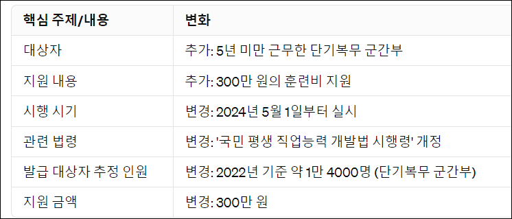 이번 정책 개정은 단기복무 군간부들도 직업능력을 향상시키고 사회복귀 후의 취업 기회를 확대하기 위해 이뤄졌습니다. 5년 미만의 근무를 마치고 전역을 앞둔 장교와 부사관 등의 군간부들도 국민내일배움카드를 통해 훈련을 받을 수 있게 되면서 전역 예정인 모든 군간부들이 직업능력개발훈련에 참여할 수 있습니다. 이를 통해 군인들의 취업 기회를 높이고 사회 재직자들의 직업 능력 향상을 도모합니다.