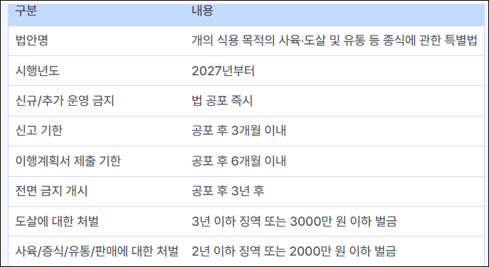 '개의 식용 목적의 사육·도살 및 유통 등 종식에 관한 특별법'(개 식용 종식 특별법)이 국회 본회의를 통과했다. 이 법은 2027년부터 개를 식용 목적으로 사육, 도살, 유통, 판매하는 것을 금지하는 내용을 담고 있다. 또한 법 공포 즉시 신규 또는 추가로 개 식용 사업을 운영하는 것이 금지되며, 위반 시에는 최대 3년 이하의 징역 또는 3000만 원 이하의 벌금을 부과한다.