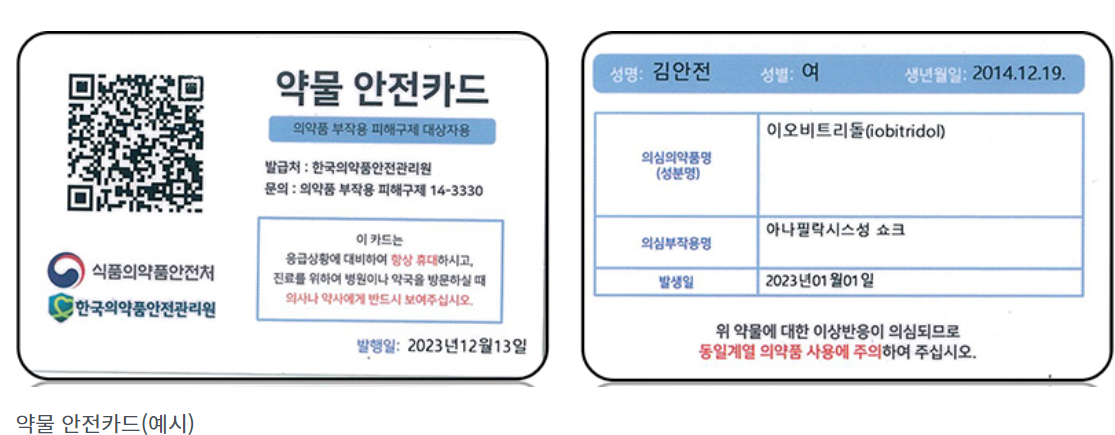 - 의약품 부작용 피해구제 진료비 지급액 상향 추진 및 실물 '약물 안전카드'의 전자화에 관한 내용이 소개되었습니다. - 의약품 부작용 피해구제 제도의 혜택을 받을 수 있는 환자들을 위해 의약품 부작용 피해구제 진료비 지급액 상향이 추진될 예정입니다. - 의약품 부작용 정보가 담긴 실물카드를 전자화하여 휴대폰 앱에서 관리할 수 있도록 개선하고, 의약품 부작용 정보에 대한 접근성을 확대할 계획입니다.