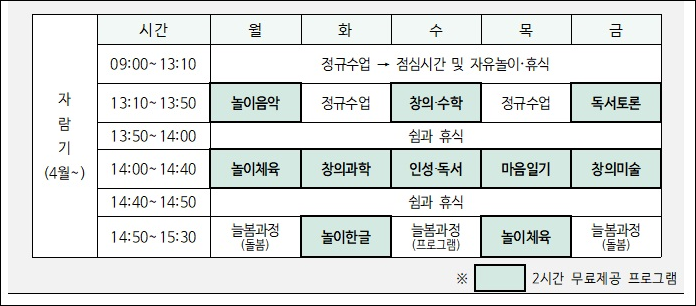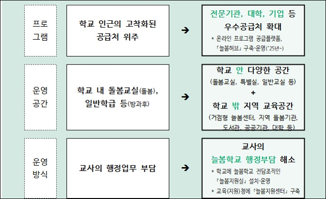 - '늘봄학교'는 학생들에게 맞춤형 프로그램을 매일 2시간 무료로 제공합니다. 이 프로그램은 학교의 늘봄학교 관련 행정업무를 전담하는 늘봄실무직원을 학교에 배치하고, 학교에 늘봄지원실을 설치하는 방식으로 운영됩니다. 또한, 학교가 직접 전국의 우수프로그램을 탐색·연결할 수 있게 지원하는 온라인 플랫폼 '늘봄허브'를 구축하는 것도 계획에 포함되어 있습니다. 이 모든 과정에서 교육당국, 선생님, 학부모, 지자체, 관련 기관, 단체 등 지역사회 구성원 모두의 참여가 필요하다고 강조하고 있습니다.
