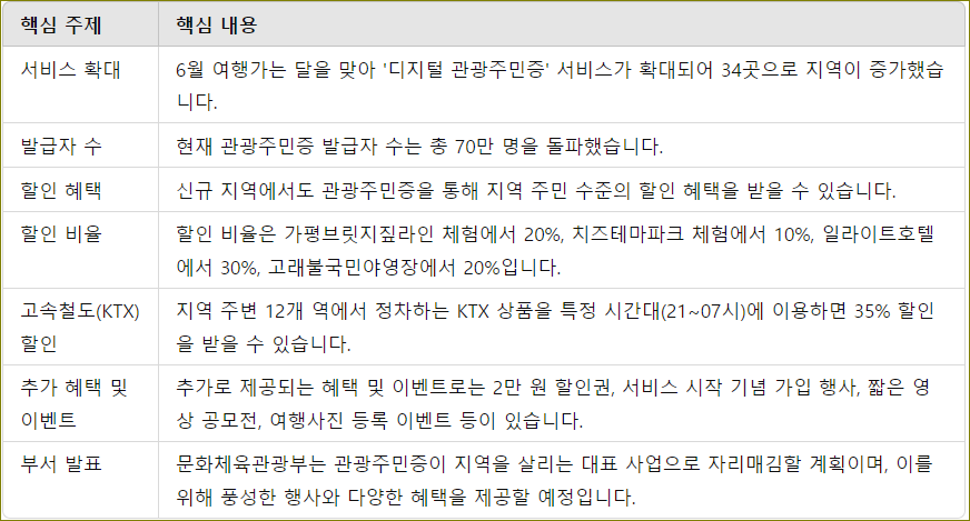 6월 여행가는 달을 맞아 '디지털 관광주민증' 서비스가 확대되며, 새로운 할인 혜택과 추가 이벤트가 눈에 띕니다. 현재 70만 명을 넘어선 발급자 수와 함께, 지역 주민 수준의 할인을 누리며 지역 경제에 도움을 줄 수 있습니다. 특히, 고속철도(KTX)와의 협력을 통해 최대 35%까지 할인을 받을 수 있는 이용 팁도 소개되고 있습니다. 또한, 다채로운 이벤트로 즐기는 관광주민증 활용법과 지역을 살리는 대표 사업의 매력에 대해 알아보겠습니다.