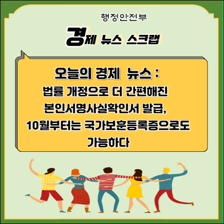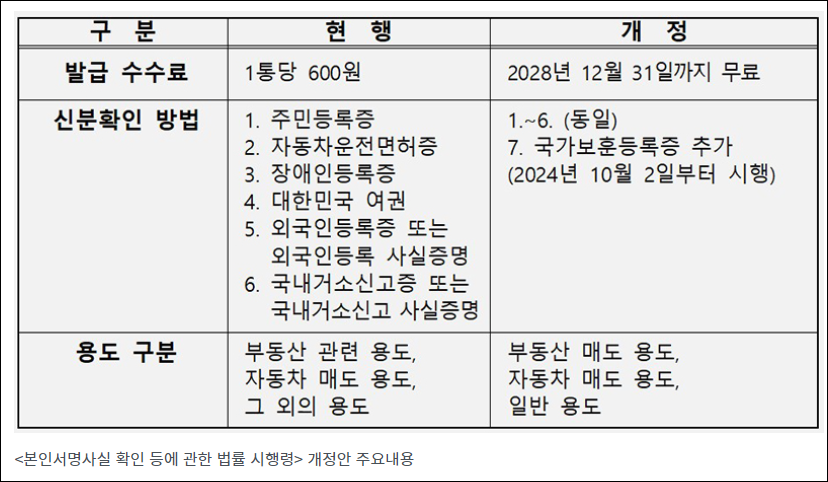 2028년까지 수수료가 면제되는 조치를 포함한 본인서명사실확인서 발급에 대한 관련 법률 시행령 개정안이 국무회의에서 통과되었다. 이에 따라 4월 2일부터 본인서명사실확인서를 무료로 발급받을 수 있으며, 10월 2일부터는 국가보훈등록증으로도 신분을 확인할 수 있게 될 것이다.