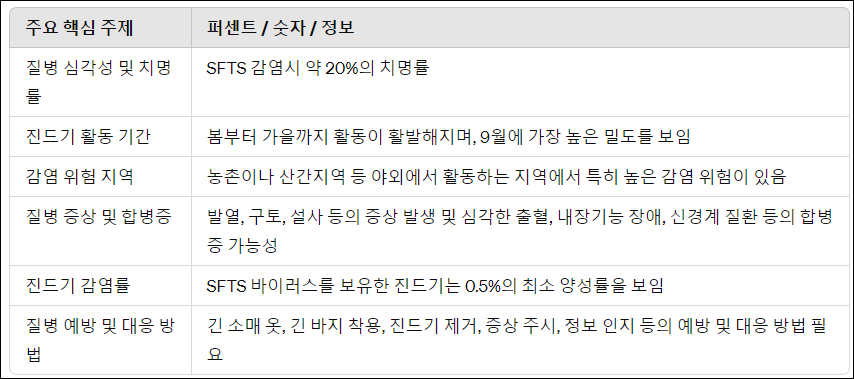 이 질병에 대한 인식과 예방이 중요한 이유는 해당 질병의 치명률과 증상의 심각성 때문입니다. SFTS에 감염되면 심각한 출혈, 내장기능 장애, 신경계 질환 등의 합병증이 발생할 수 있으며, 치명률은 약 20%에 이릅니다. 더욱이 이 질병에 대한 특이적인 치료법이 없어서 예방이 가장 중요합니다. 따라서 야외활동 시 참진드기에 대한 주의가 필요하며, 예방수칙을 준수하여 질병의 전파를 최소화해야 합니다.