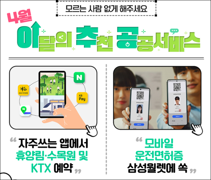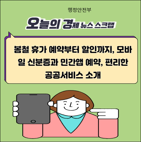 봄이 왔습니다! 행안부가 이달의 추천 공공서비스를 소개합니다. 봄철에는 열차 예매부터 휴양시설 예약까지가 중요한데요, 이를 민간앱을 통해 한 번에 처리할 수 있게 되었습니다. 더불어 모바일 신분증 서비스도 소개되어 관광지에서의 신분 확인이 더욱 간편해졌습니다. 지금 바로 확인해보세요!