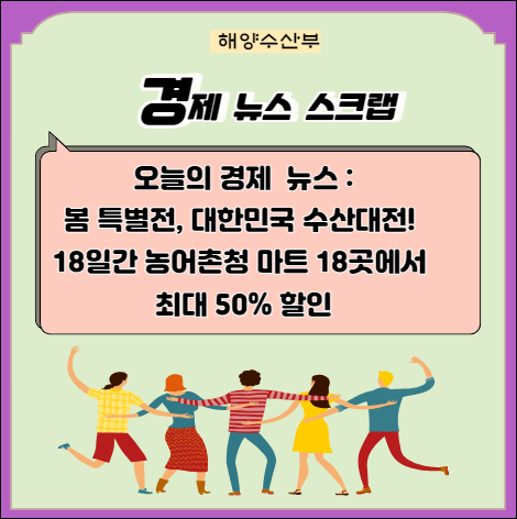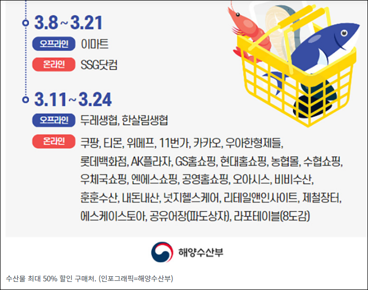 해양수산부는 7일부터 24일까지 18일 동안 ‘대한민국 수산대전-봄 특별전’을 개최할 계획입니다. 이 행사는 마트 18곳과 온라인몰 27곳에서 국산 수산식품을 구매하는 소비자에게 최대 50%의 할인을 제공합니다. 또한, '오징어·참조기 정부 비축 물량 반값 특별전'도 22일까지 진행됩니다.