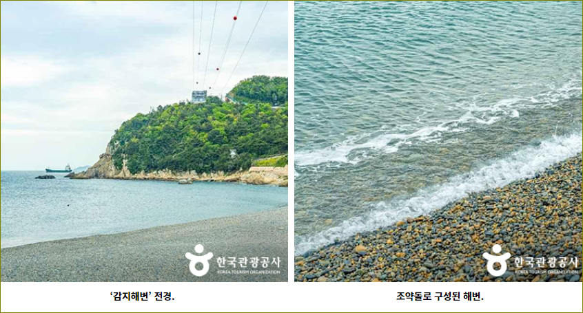 감지해변은 조약돌로 구성된 해변으로, 태종대 일대의 아름다운 자연경관을 감상할 수 있는 곳입니다. 파도에 휩쓸린 조약돌이 서로 부딪혀 내는 청아한 소리는 깊은 울림을 선사합니다. 봄에는 해안가 산책로를 따라 야생화를 감상하며 걷기에 좋습니다. 또한, 감지해변은 부산 최고의 조개구이 촌으로 유명하며, 연탄불에 익힌 조갯살을 맛볼 수 있는 다양한 식당이 있습니다.