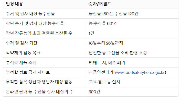 식품의약품안전처는 온라인에서 판매되는 농·수산물의 증가에 대응하여 18일부터 26일까지 300건의 농수산물을 집중 수거 및 검사할 예정이다. 수거된 제품은 잔류농약, 중금속, 곰팡이독소 등에 대해 검사될 것이며, 검사 결과가 부적합으로 판명되면 즉시 판매 금지 및 회수·폐기 등 조치가 이루어지며 해당 정보는 식품안전나라에 공개될 예정이다. 또한, 부적합 품목의 생산자와 영업자에 대한 교육 및 홍보 등도 실시될 예정이다.
