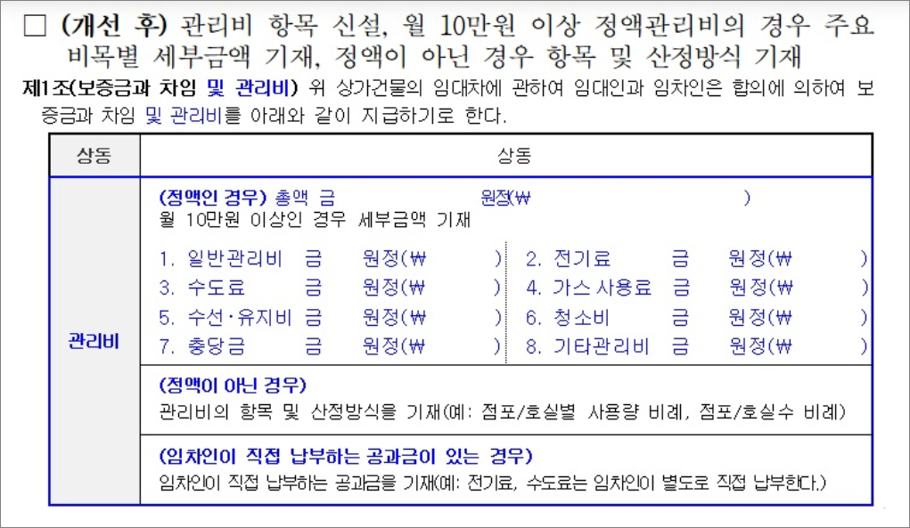 2024년 5월 8일, 법무부와 국토교통부는 상가 건물 임대차 계약 시 관리비의 투명성을 높이기 위해 표준 계약서 양식을 개선하기로 발표했습니다. 이제부터는 상가 건물 임대차 계약을 맺을 때, 월 관리비가 10만 원 이상일 경우 그 세부 내역을 명시해야 합니다. 이는 관리비의 주요 비목별 세부 내역 구별 표시 또는 금액이 정해진 경우 관리 항목과 산정 방식을 기재하는 것을 의미합니다.
