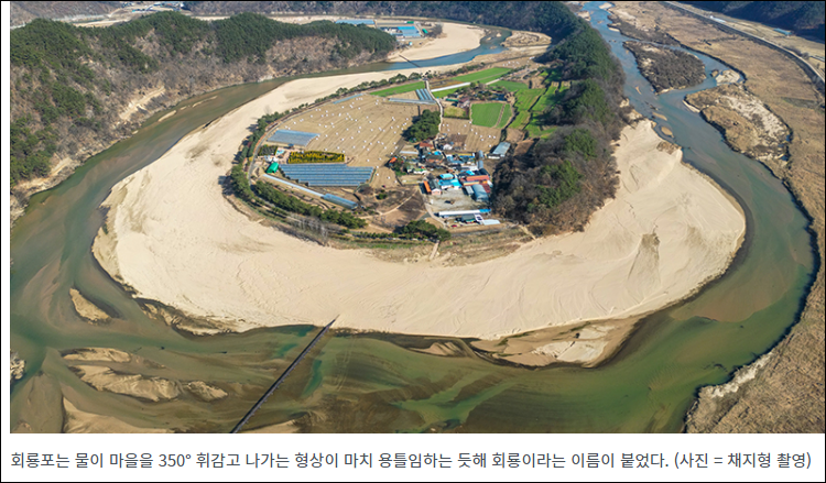 3. 경북 예천군의 회룡포: 이곳은 '육지 속의 섬'으로 불리며, 마을을 감싸는 강물의 풍경을 볼 수 있는 회룡대가 있습니다. 또한, 마을에는 드라마와 예능 프로그램의 촬영지와 노래비가 있습니다.