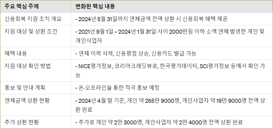 - 대상: 2021년 9월 1일부터 2024년 1월 31일까지 2000만 원 이하의 소액 연체가 발생한 개인 및 개인사업자. - 상환 조건: 2024년 5월 31일까지 연체금액을 전액 상환해야 합니다.