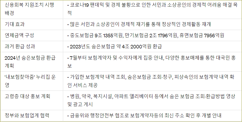 결론 : 연체금액 전액 상환 시 제공되는 신용회복 지원은 서민과 소상공인들에게 큰 도움이 될 것입니다. 5월 31일까지 연체금액을 전액 상환하고 신용회복 혜택을 받아 경제적 재기를 노려보세요. '내보험찾아줌' 웹사이트를 활용하여 자신의 보험계약 내역을 조회하고 숨은 보험금을 찾아 경제적 부담을 덜 수 있는 방법도 고려해 보세요. 금융위원회의 이번 조치는 많은 이들이 더 나은 경제적 미래를 꿈꿀 수 있는 기회를 제공할 것입니다.
