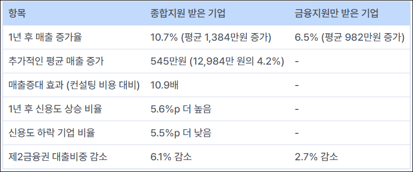 서울시의 소상공인에 대한 종합지원(금융+경영)이 금융지원만 받은 기업보다 더 큰 효과를 보였습니다. 1년 후 종합지원을 받은 기업의 매출 증가율은 10.7%로, 금융지원만 받은 기업보다 4.2% p 높았습니다. 또한, 신용도 상승 비율도 5.6% p 높게 나타나 종합지원의 효과를 입증하였습니다.