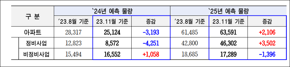 2023년 11월 기준으로 재산정한 결과, 2024년에는 2만 5천호, 2025년에는 6만 4천 호가 입주할 것으로 전망되었습니다. 이 중 2024년에는 정비사업이 8,572호, 비정비사업이 16,552호, 2025년에는 정비사업이 46,302호, 비정비사업이 17,289호로 예상됩니다. 이번 공개자료는 일부 사업장의 여건 변화로 인해, 지난 8월 시가 발표한 예측물량과 비교해 일부 변동이 있었습니다. 특히, 대규모 정비사업의 준공일 조정 및 공공주택의 연기 등이 주요 변동 사유로 나타났습니다.