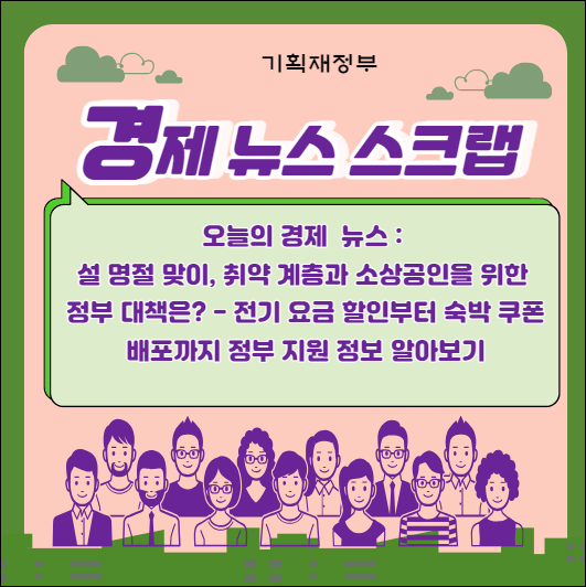 설 명절을 앞두고 취약계층과 소상공인, 그리고 관광객을 위한 다양한 정부 대책이 진행되고 있습니다. 취약계층에게는 전기요금 할인과 온누리 상품권의 한도 상향, 소상공인에게는 전기요금 지원과 이자 환급 등이 이루어지며, 관광객들을 위해 숙박쿠폰과 할인 프로모션이 준비되어 있습니다.
