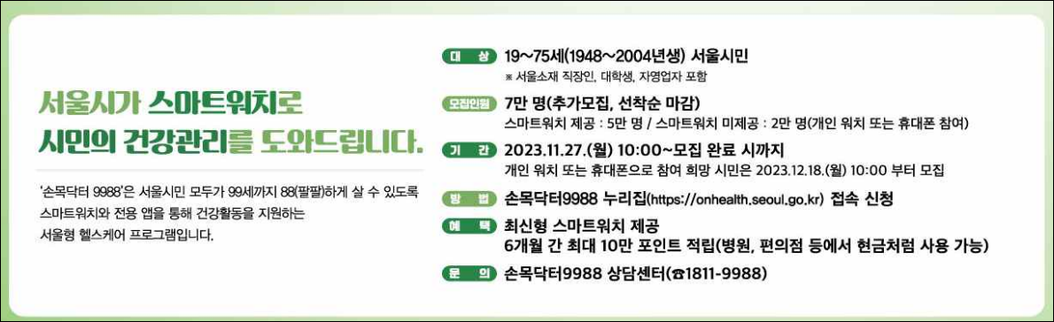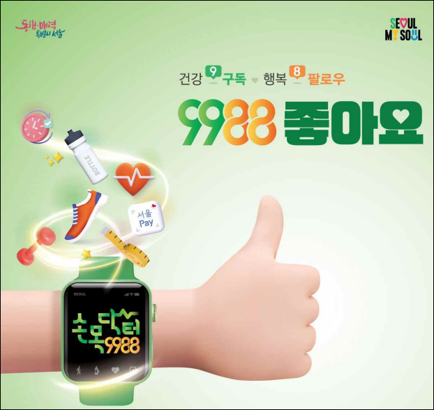 서울시는 '손목닥터 9988' 프로그램 참여자 7만 명을 추가로 모집한다고 발표했습니다. 이는 시민의 건강을 위한 독특한 사업으로, '99세까지 88(팔팔)하게 살자'는 의미를 내포하고 있으며, 정보통신 기술(ICT)을 활용한 스마트 헬스케어 사업입니다. 이번에 모집하는 참여자들은 건강 활동 참여도에 따라 6개월 동안 최대 10만 포인트를 지급받을 수 있습니다.