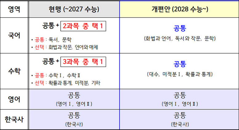 교육부는 2028학년도 대학입시제도 개편안을 확정하였습니다. 이에 따라 중학교 2학년 학생들이 수능을 치를 때, 국어, 수학, 사회, 과학은 선택과목 없이 통합형으로 응시하게 됩니다. 또한, 내신 평가방식도 기존 9등급에서 5등급 체제로 변경됩니다. 이번 개편은 학생들이 문과, 이과 선택에 따른 수능 점수의 유불리를 해소하고, 사회·과학 분야의 기초소양을 바탕으로 한 융합적인 학습을 유도하는 목적이 있습니다. 특히 심화수학은 수능에서 제외되었으며, 고교 내신에서는 사회·과학 융합 선택과목의 상대평가 석차등급은 기재되지 않습니다.