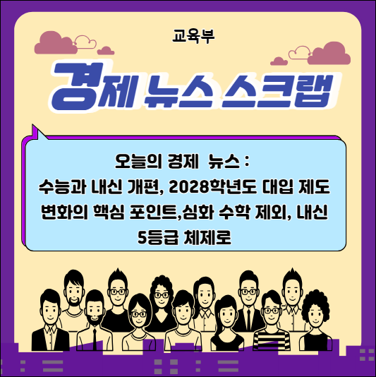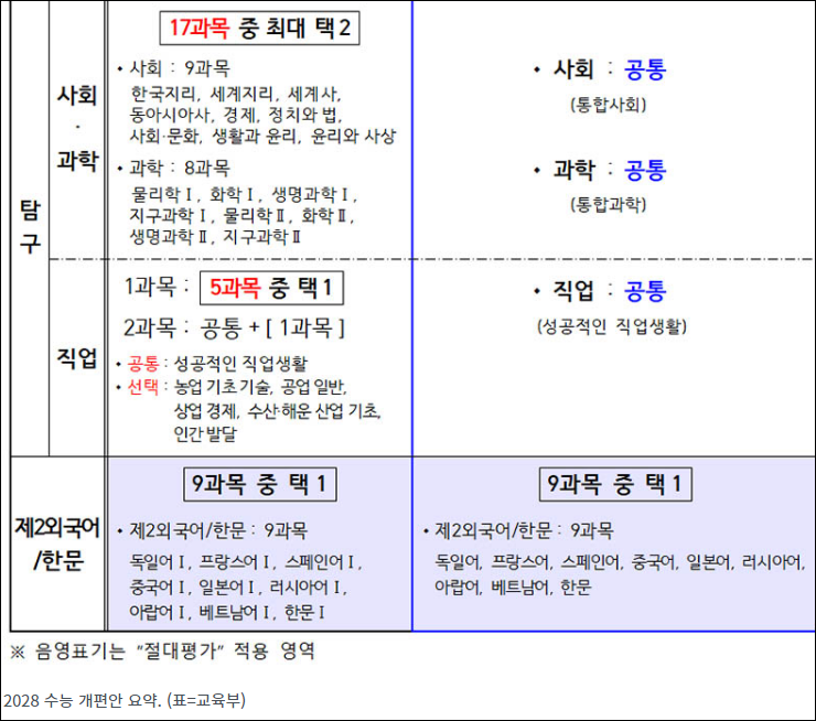 2028학년도 대학입시제도 개편안이 확정되었습니다. 이는 올해 중학교 2학년 학생들이 치를 예정이며, 수능 과목은 국어, 수학, 사회, 과학이 선택과목 없이 통합형으로 시험을 봐야 하는 체제입니다. 내신은 기존 9등급에서 5등급 체제로 바뀌며, 수능에서는 ‘심화수학(미적분Ⅱ·기하)’이 제외되었습니다. 또한 고교 내신에서 사회·과학 융합 선택과목은 상대평가 석차등급이 기재되지 않습니다.