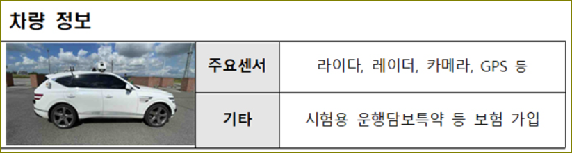 | 검증 절차 | 1단계: 시험운전자가 운전석에 착석. 2단계: 시험운전자가 조수석에 착석, 비상조치를 위한 원격관제, 제어 또는 차량 외부 관리 인원 배치. |