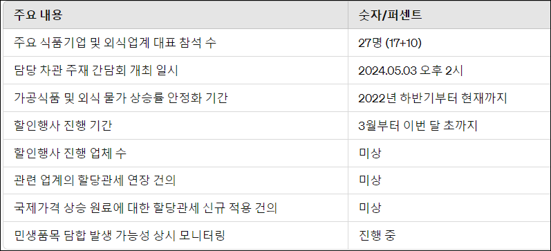 정부는 주요 식품기업과 외식업계와의 간담회를 통해 협력을 촉구하고 물가 안정을 위한 노력을 요청하고 있습니다. 또한, 민생품목에 대한 담합 가능성을 상시 모니터링하고, 발생 시 신속하게 조사에 착수하여 시장 질서를 유지하고자 합니다. 이를 통해 소비자들에게 안정적이고 신뢰할 수 있는 시장 환경을 제공하고자 합니다.