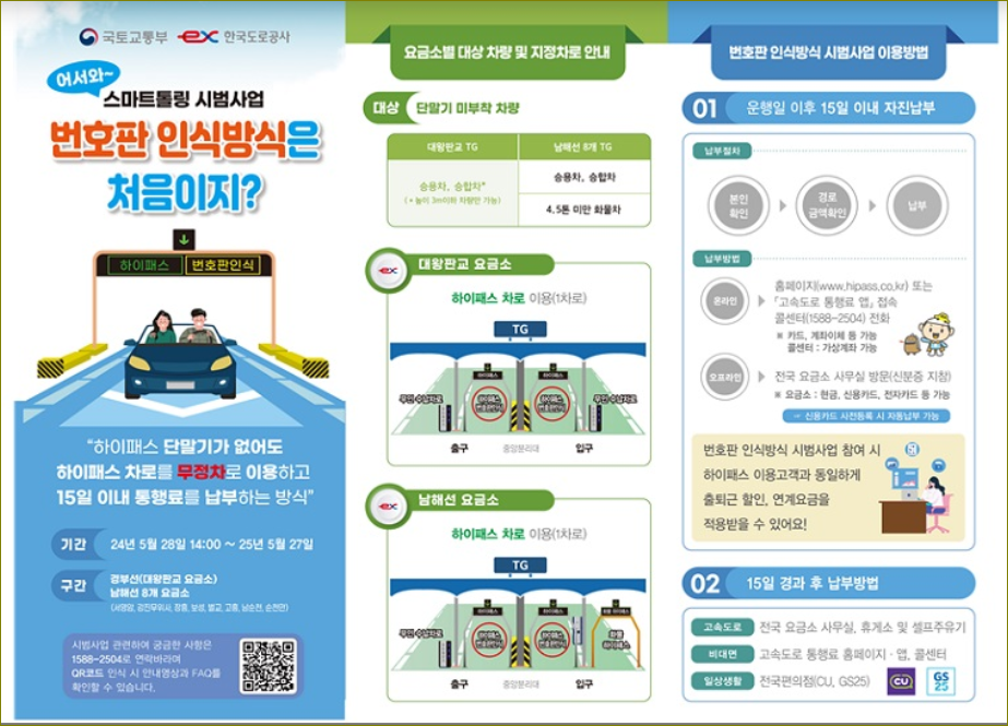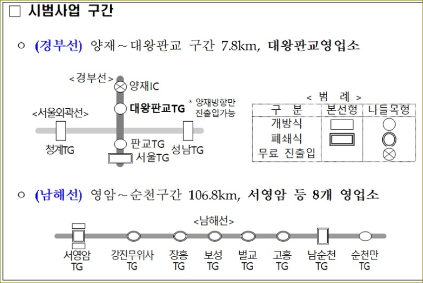 이번 시범사업에서는 대왕판교 등 9개 요금소에서 차량은 번호판 인식을 통해 무정차로 통행료를 납부할 수 있다. 이를 위해 차량 소유자들은 번호판과 신용카드를 미리 등록하여 신용카드 사전등록 방식을 통해 자동 납부하거나, 운행일 이후 15일 이내에 자진납부 방식으로 납부할 수 있다. 시범사업을 통해 발생하는 불편사항과 영상처리 안정성 등을 고려하여 계속해서 개선해 나갈 계획이다.
